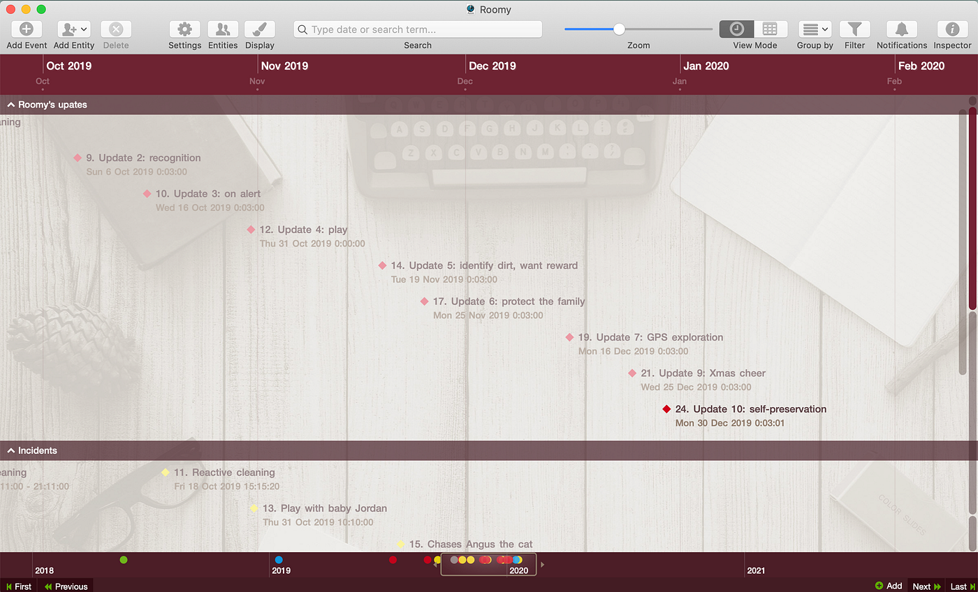Aeon Timeline helps you to create a story outline, complete characters, locations and story arcs, on a timeline view that lets you zoom in and out at any scale from seconds to millennia. You can use conventional calendars or create your own calendar for the Munchkin kingdom on the planet Zarg.