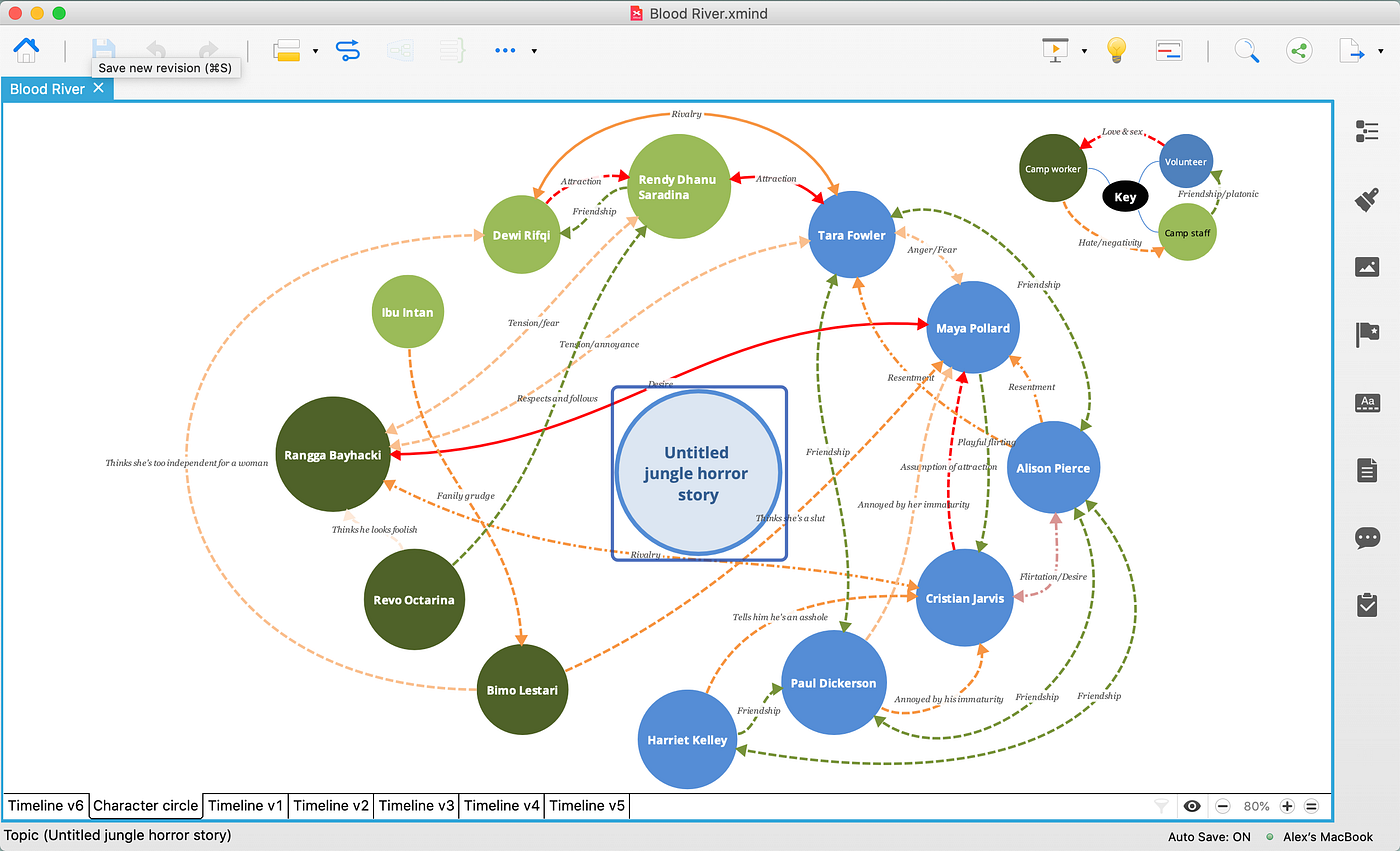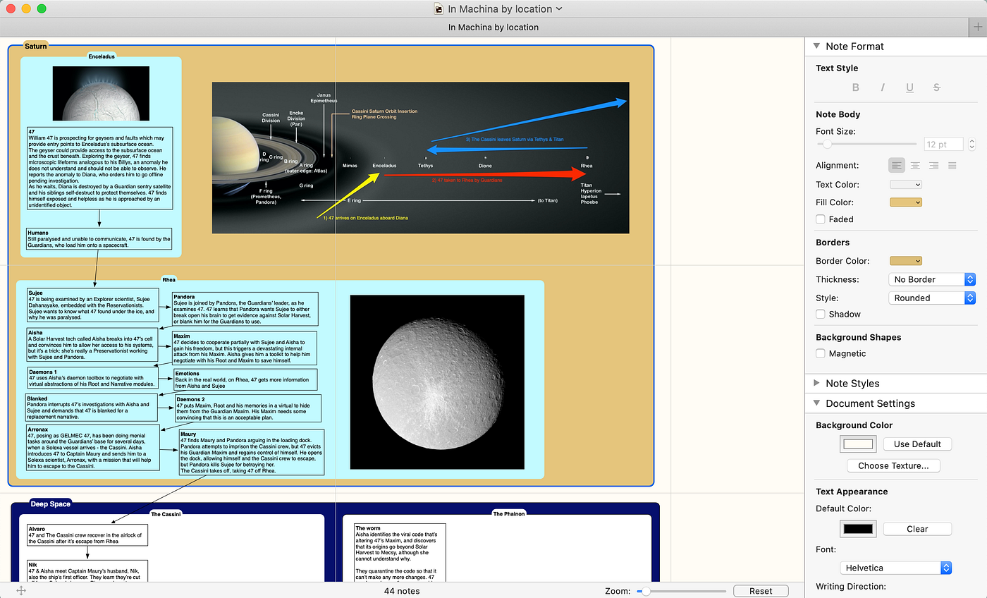 I've been using it for about five years and used it to plan all of Blood River, from the outline/timeline to character relationship diagrams. I've also used it for many other projects where I wanted the ability to zoom in and out at different levels of detail, apply a wide range of formatting and create linked mind-maps for complex projects.
