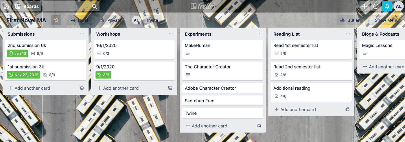 5 Trello . Some writers use Trello for everything for fundamentals like story outlining and character planning — and there's no reason why not — but I like to use it for the process around my novel and the MA it's a part of.